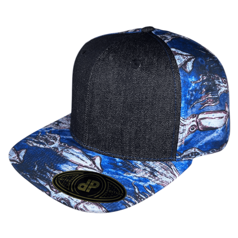 58 cm Double Portion Supply snapback with denim front panels and sublimated Kraken or Squid in various colorways