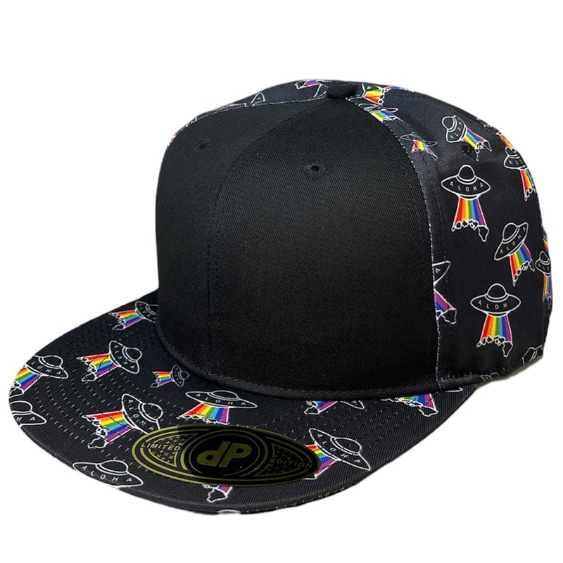58cm Double Portion Supply snapbacks with black front panels and sublimated Aloha UFO on side panels and bill