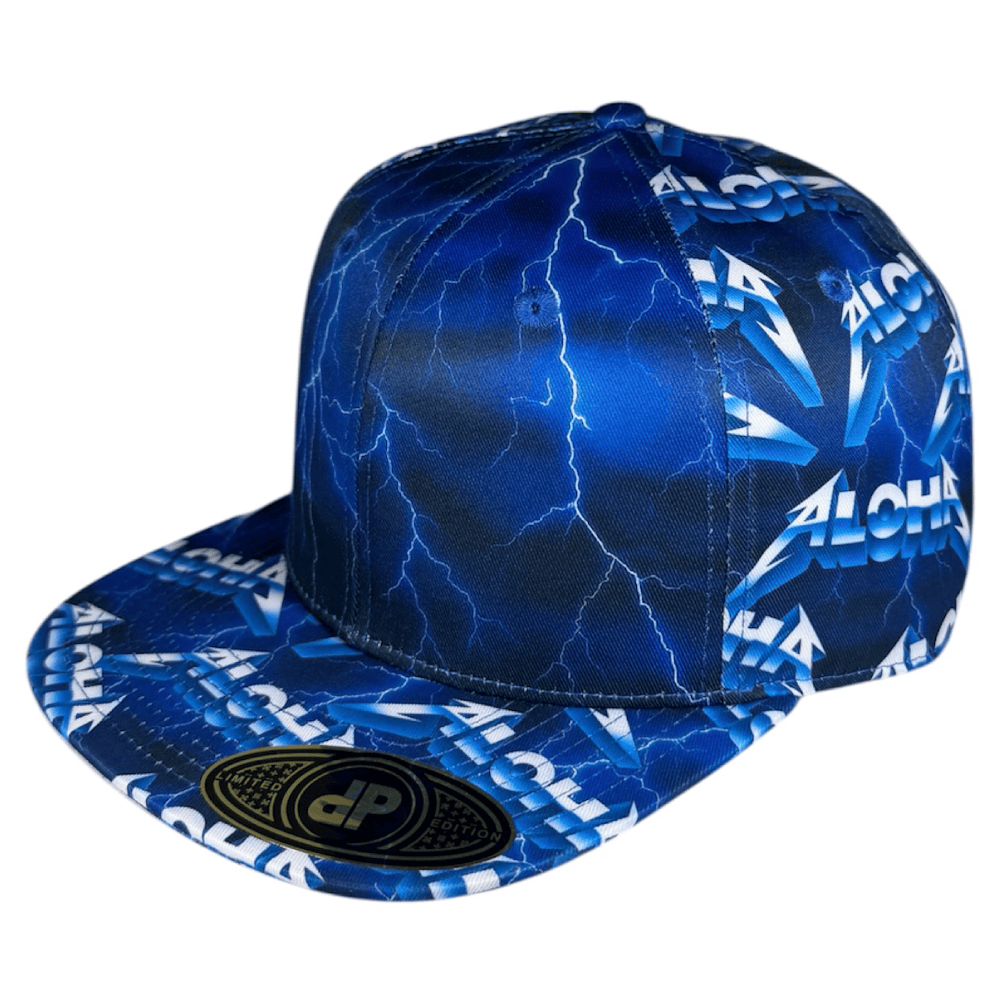 58cm Double Portion Supply snapback with blue lightning front panels and ALOHAILLA side panels and bill in blue to white gradient