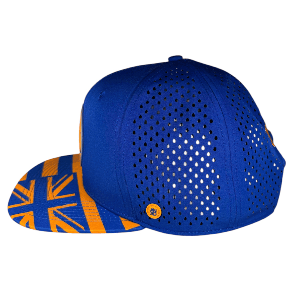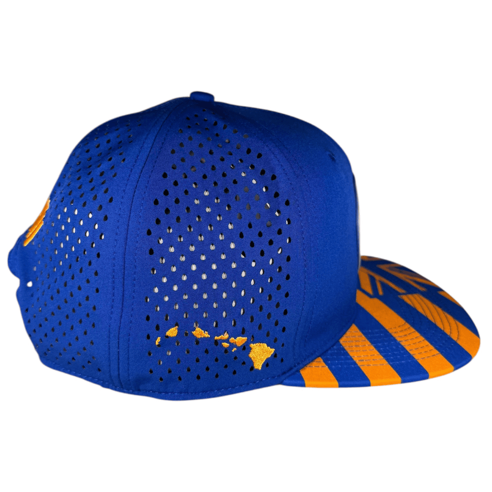 Double Portion Supply Royal/ Orange Hawaii flag bill snapback with rubber ANXD Hawaii Kanaks patch, Hawaiian islands on wearers right and Hawaii over the snap
