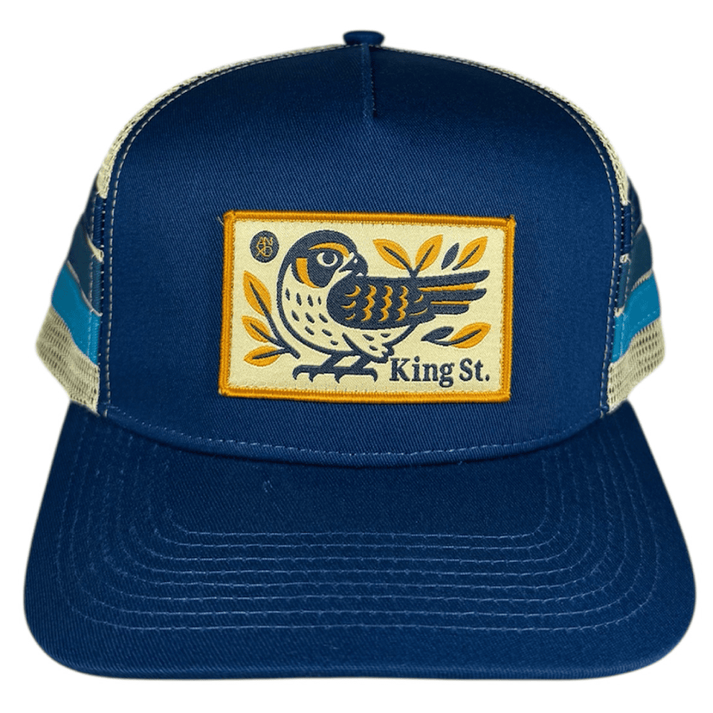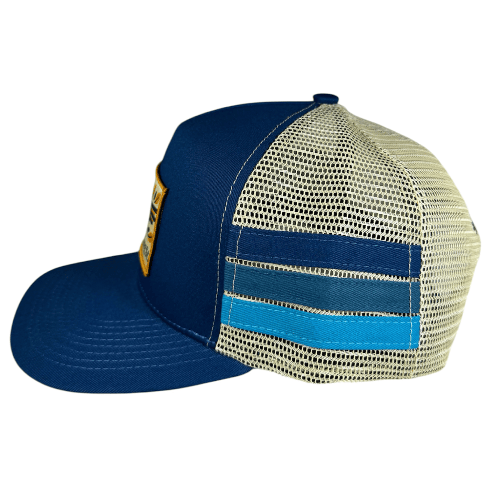 58cm Double Portion Supply mid curve snapback with navy front panel, tan mesh, Blue stripes on side and ANXD Kestrel King Street patch