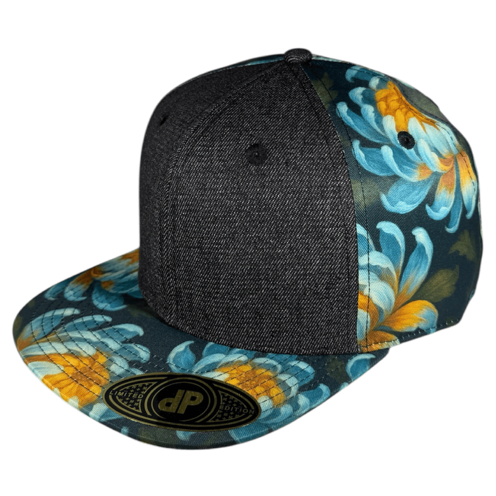 58cm Double Portion Supply snapback with black denim front panels and sublimated painterly Chrysanthemum on side panels and bill