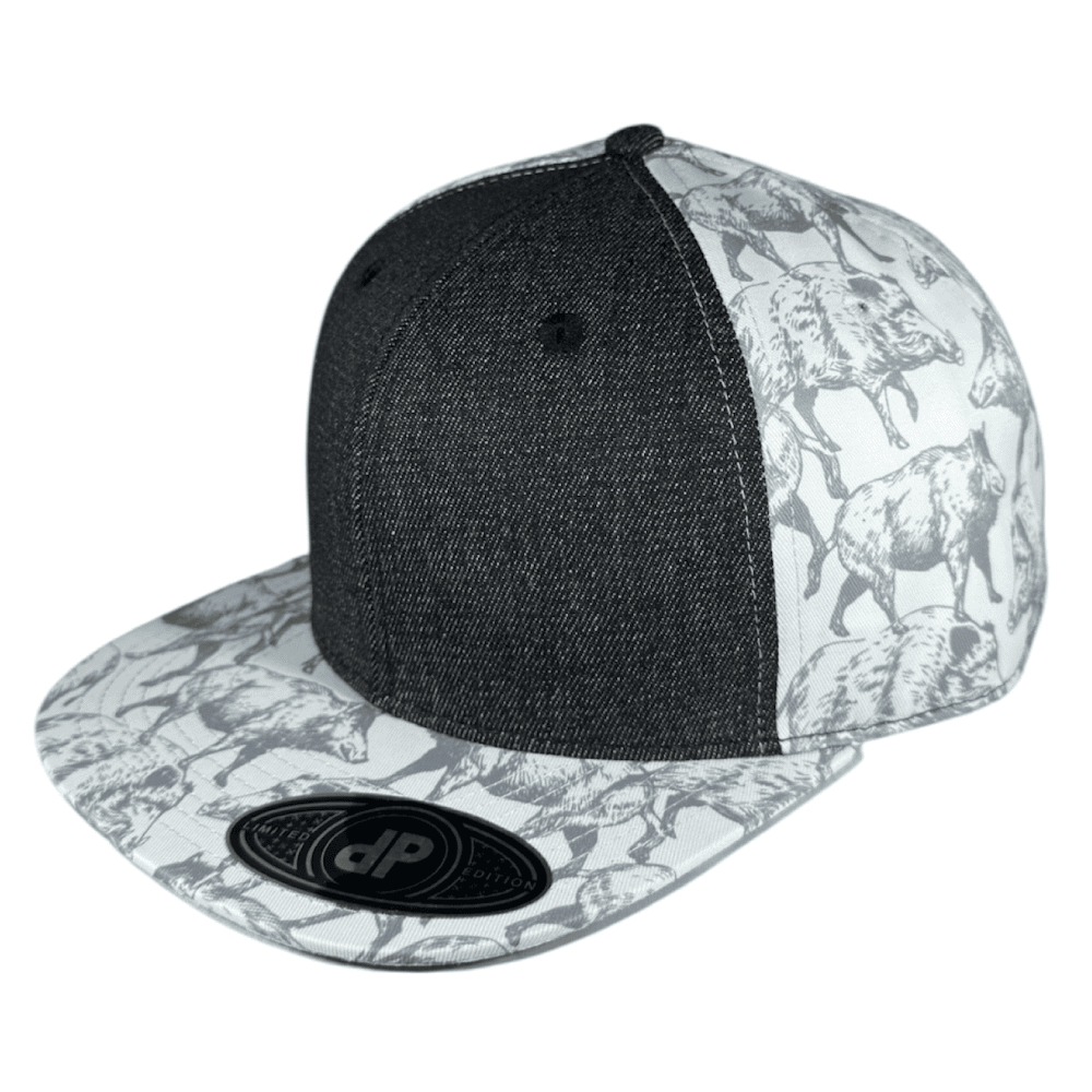 58cm Double Portion Supply snapback with black denim front panels and Pua’a (Boar, Pig) sublimation