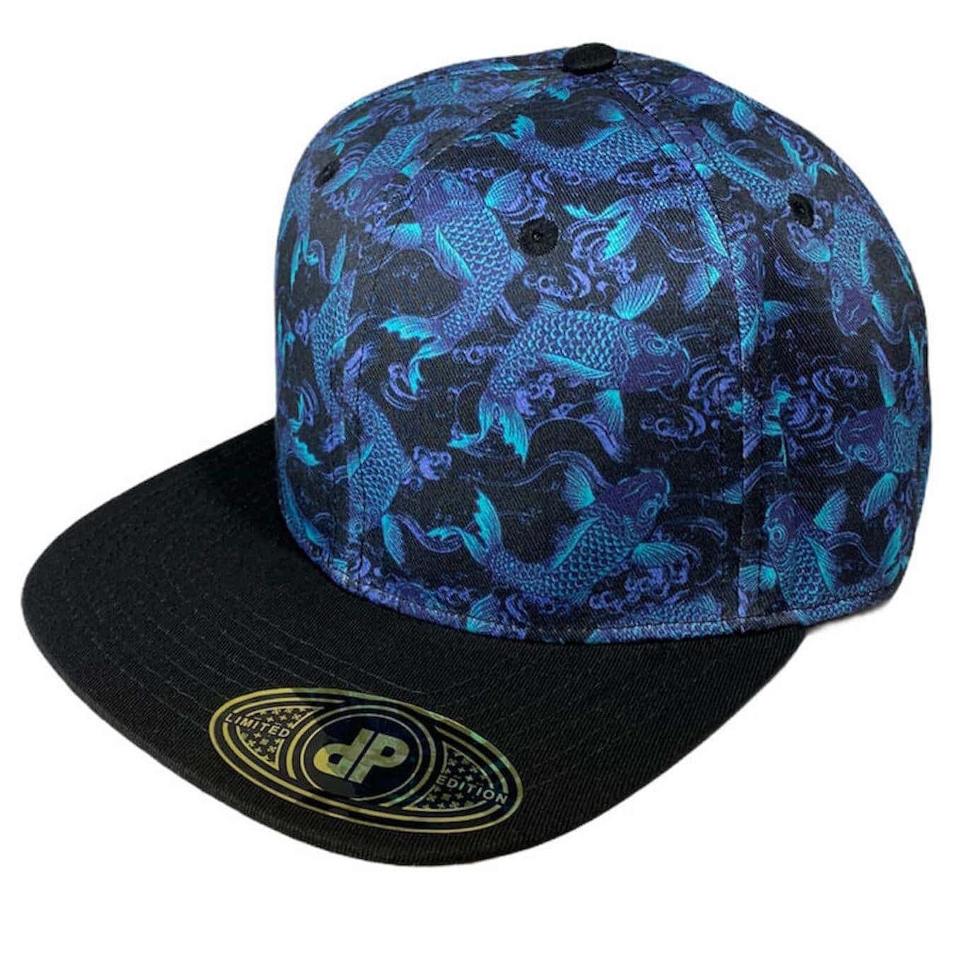 58cm Double Portion Supply snapback with black bill and sublimated Koi fish in teal and blue