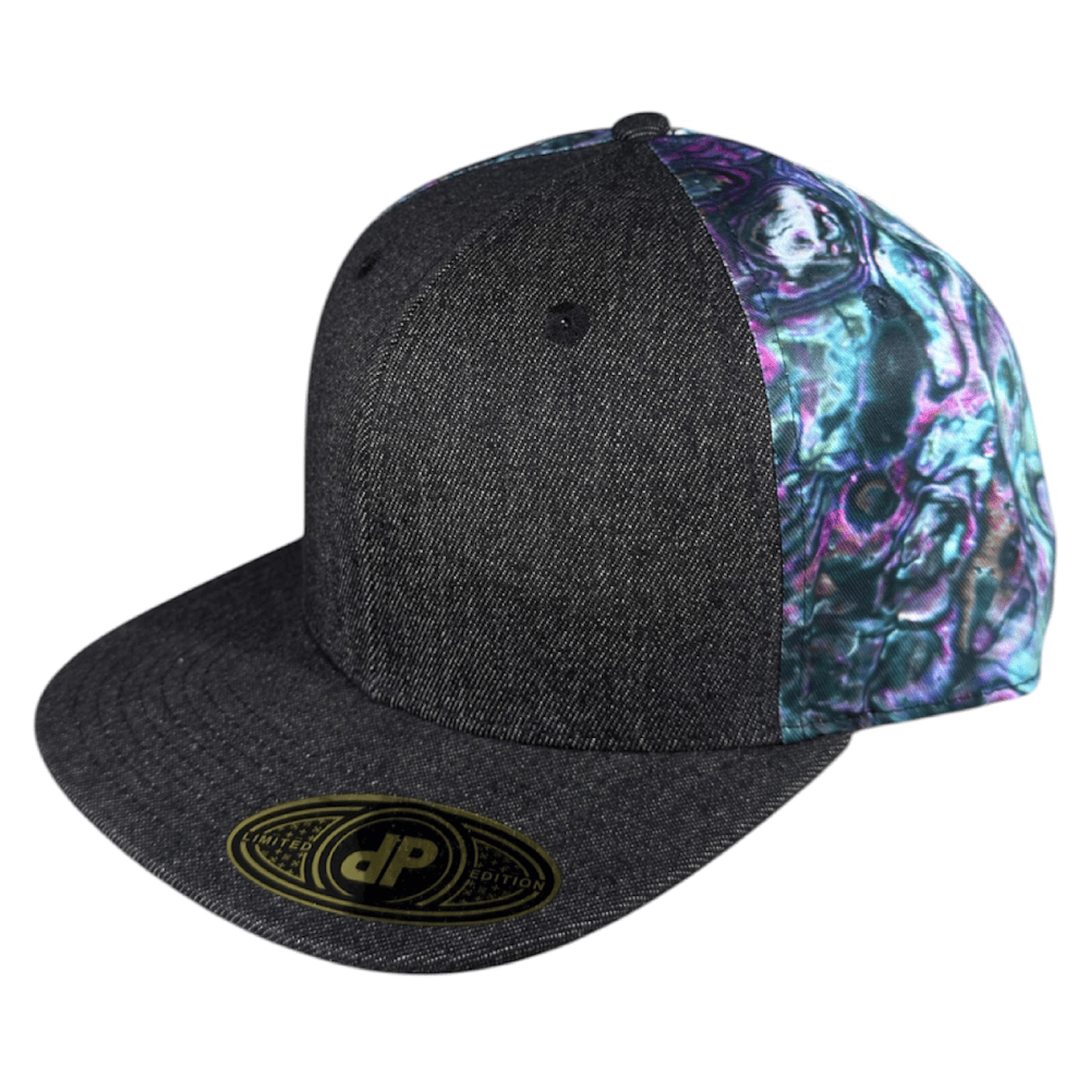 58cm Double Portion Supply snapback with black denim front panels and bill with abalone sublimation