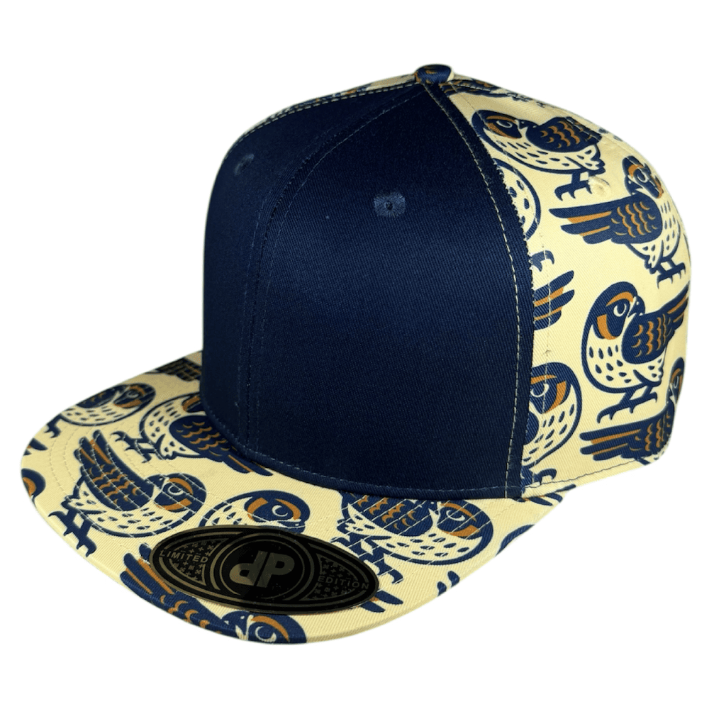 58cm Double Portion Supply snapback with navy front panels and the small American Kestrel falcon sublimated on the side panels and bill