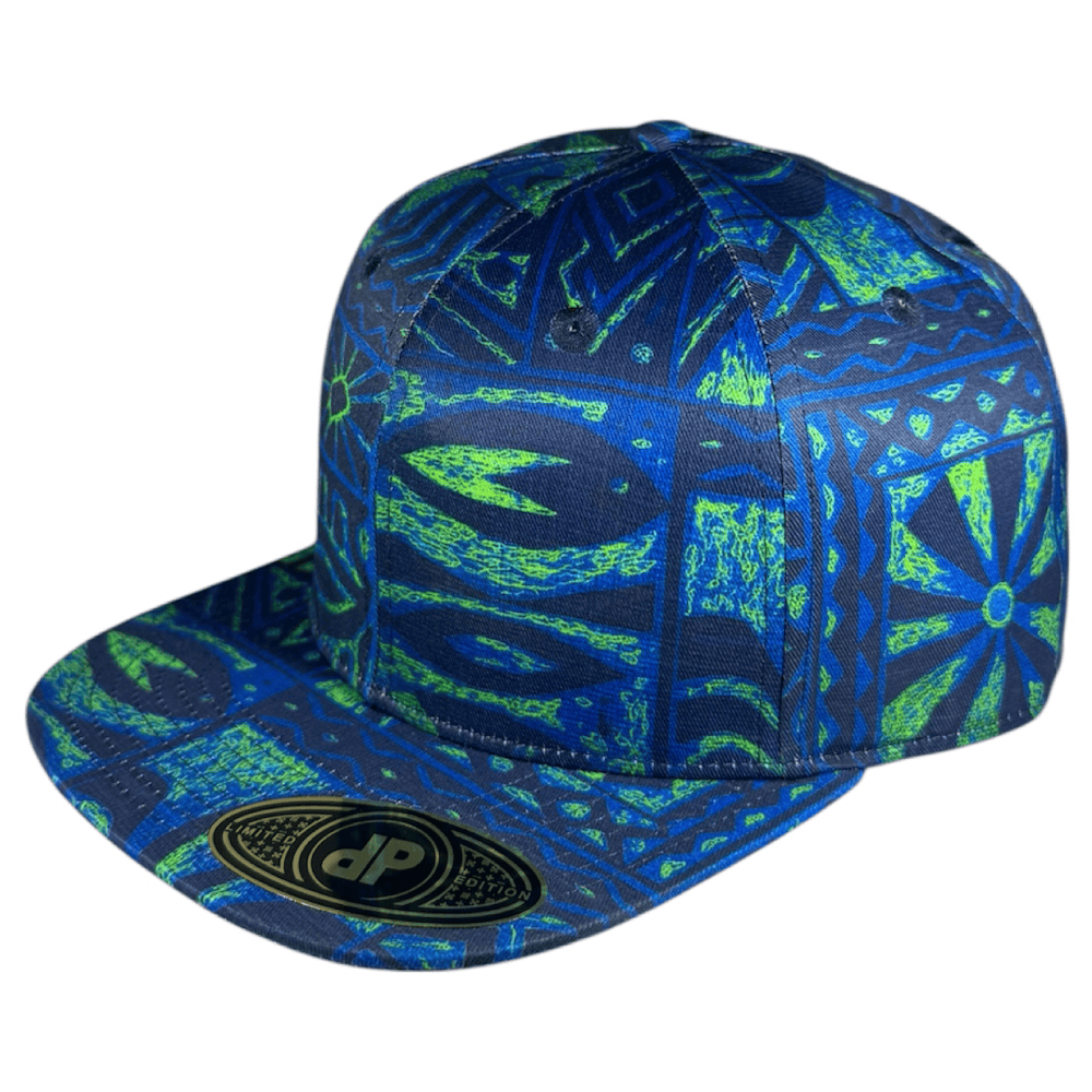58cm Double Portion Supply snapback with sublimated Neon Synthwave (Glow appearance) Kapa (Hawaiian bark cloth) in blue, green and black