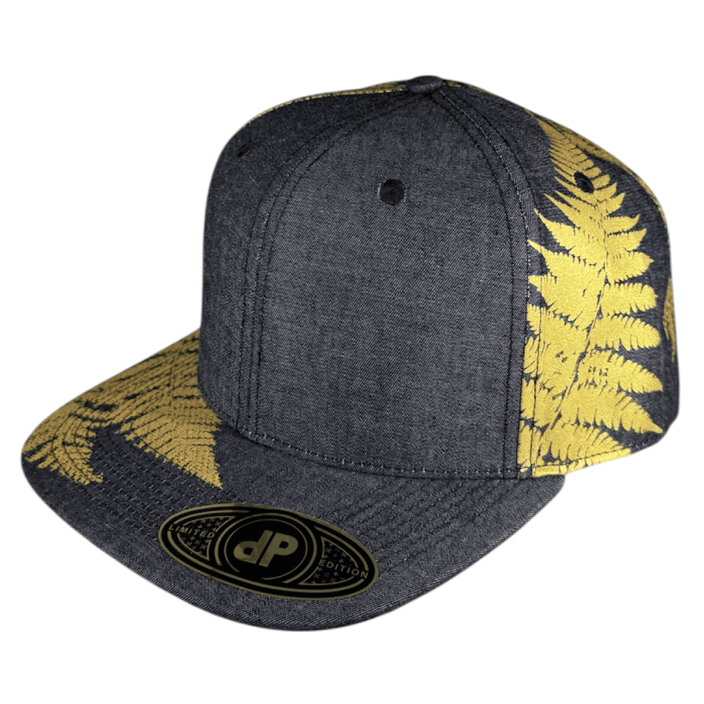 58cm Double Portion Supply snapback with black denim front panels and screen printed golden ferns
